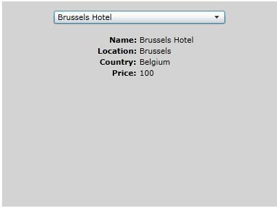 8. We will compile the solution again and then press the F5 button. The application should now run, allowing us to select a hotel in the ComboBox. Each selection change will trigger an event that shows the details of the selected item using data binding as shown below.